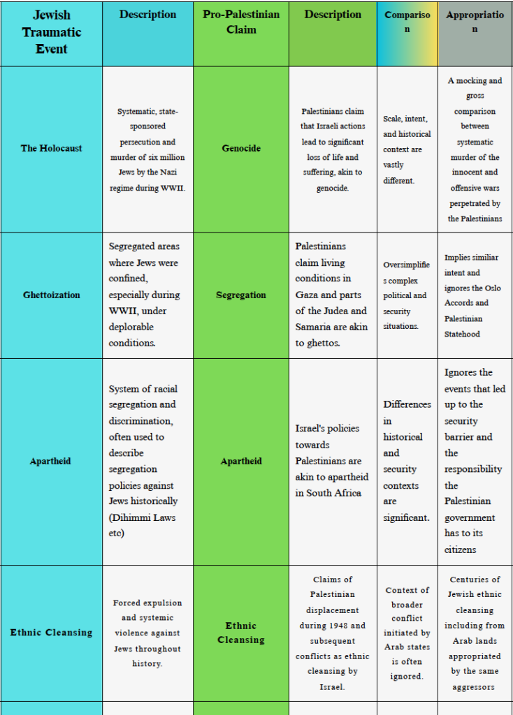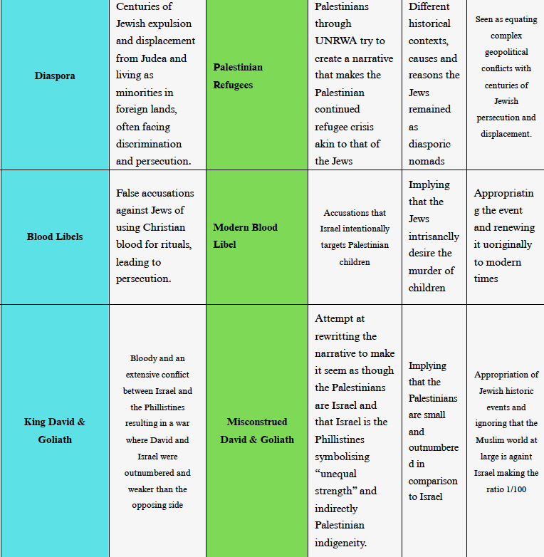 Below, see a side-by-side demonstration of some Jewish historical events paralleled to Palestinian claims along with their refutes: